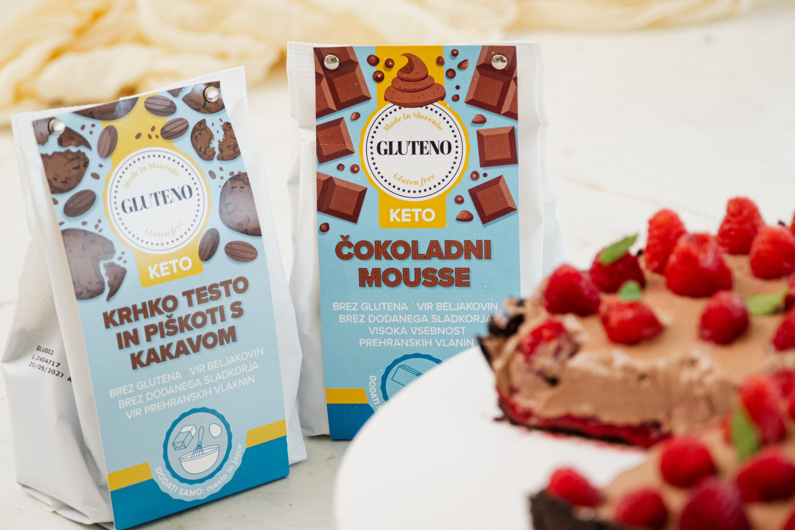 Sestavine: Mandljeva moka, sladilo (eritritol), indijski trpotec, kakav v prahu 6%, koruzni škrob, mlečne beljakovine, sredstva za vzhajanje (difosfat, natrijev karbonat), sol, zgoščevalec (guar gumi)